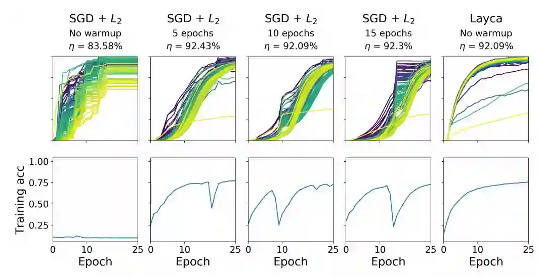 图 4 显示了使用高学习率(1/3)、不同的预热时间(0,5,10 或 15 个 epoch 进行预热)进行训练时的层旋转和训练曲线。我们观察到,在没有进行预热的情况下,SGD 会产生不稳定的层旋转,而且训练准确率在第 25 个 epoch 之前都没有提升。使用预热带来了显著的性能提升:在 25 个 epoch 后,训练的准确率达到了 75%,只不过仍然会有一些训练曲线的不稳定性存在,同时会出现一个陡峭的层旋转下降。