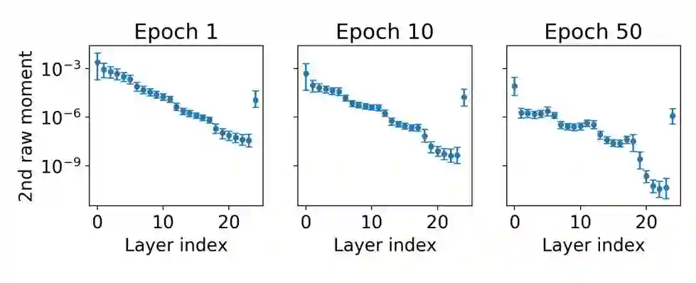 近年来,自适应梯度方法在机器学习领域逐渐兴起(例如,RMSprop[35],Adagrad [8],Adam [22])。图 5 显示了在第 1,10 和 50 个 epoch 结束时测量的每一层的第 10,50 和 第 90 个百分位的矩估计。该图表明,自适应梯度方法可能对层旋转有很大的影响。