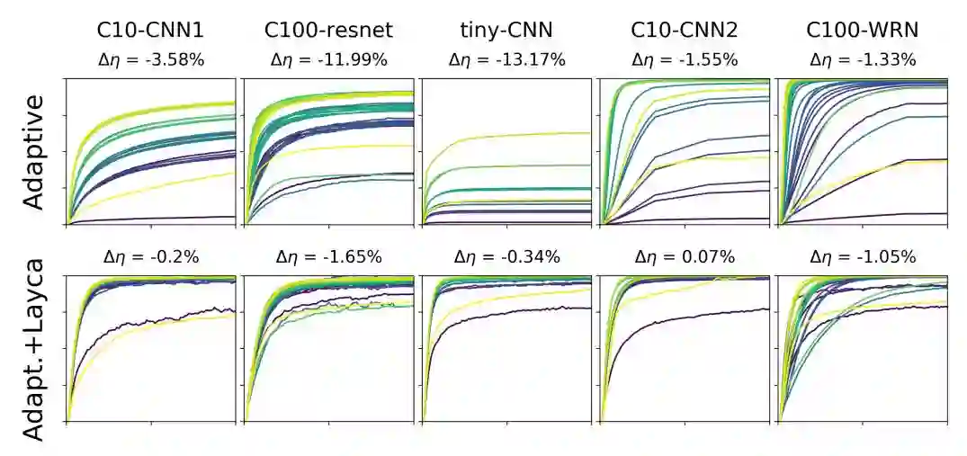 图 6:使用自适应梯度方法(每个任务/列分别使用 RMSProp,Adam,Adagrad,RMSProp+L2 和 Adam+L2),生成的层旋转曲线和相应的测试准确率,第一行不使用 Layca 控制层旋转,第二行使用了 Layca 控制层旋转。