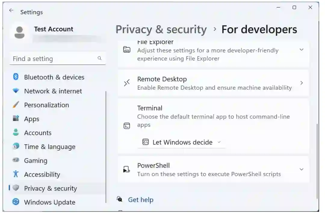 默认设置可以通过 Windows 设置中的 "隐私与安全">"面向开发者 "页面以及 Windows Terminal 设置中的 "启动 "页面上进行改动。