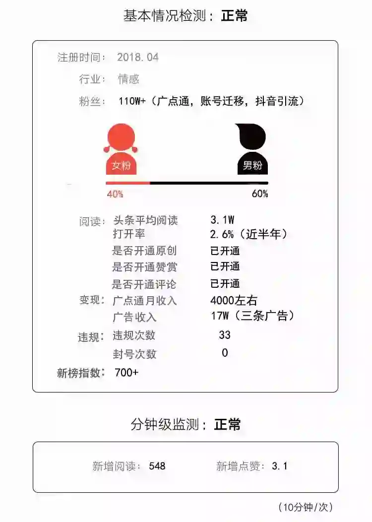 公号创建于2018年4月,内容主要为励志情感鸡汤类文章,近半年头条打开率为2.6%.粉丝数110W+,来源于广点通、两次账号迁移和抖音引流,主要为年轻群体。只做过三次小说带原文链接的头条软文推广,广告收入17W。33违规,0封号。因变现难并且号主个人精力有限,所以打算出售。