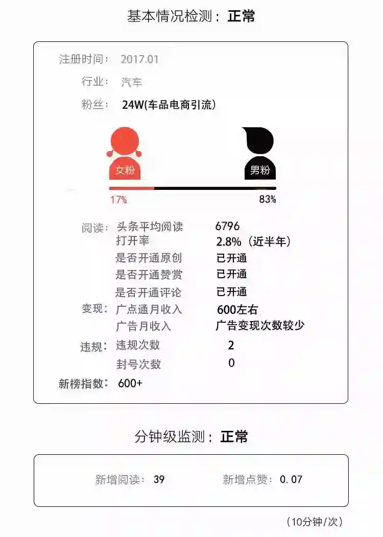 公号创建于2017年1月,内容主要为汽车品牌信息以及汽车类相关文章,近半年头条打开率为2.8%.粉丝数24W,来源于自己做的车品电商引流,95%为车主,粉丝精准,且每一个粉的车型、车品和车主电话号都通过自己做的软件登记过,是变现非常好的数据支撑。接过丰田汽车的品牌预售推广,2W-3W一条。2违规,0封号。因号主业务转型所以打算出售。