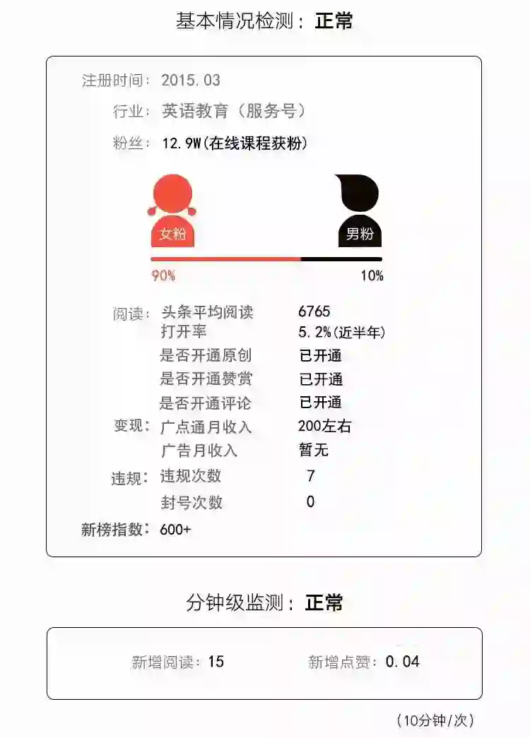 公号创建于2015年3月,内容主要为少儿英语教育及育儿知识,近半年头条打开率为5.2%.粉丝数12.9W,来源于在线课程获粉,主要为3-12岁孩子的妈妈,女粉占比90%.暂未进行广告变现,曾做过在线课程,年收入上百万。7违规,0封号。因号主业务调整所以打算出售。