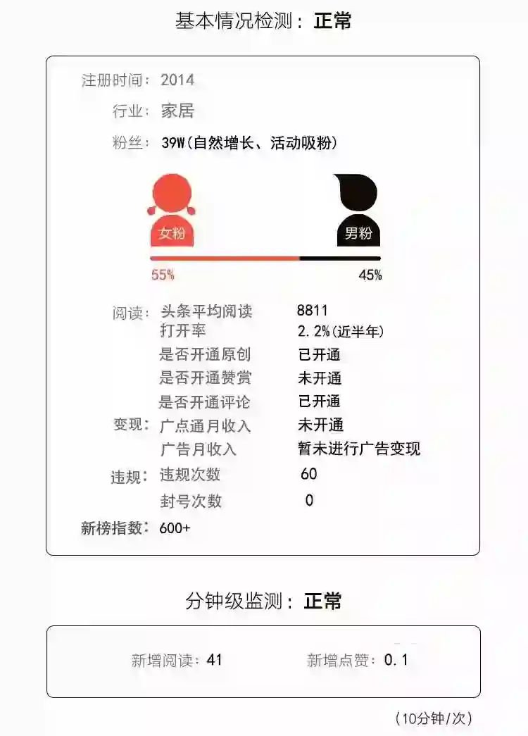 创建于2014年,主要分享家装干货,是一个优质垂直家居号,近半年头条打开率为2.2%.粉丝数39W,主要为25-40岁间有房屋装修需求的人,有一定购买力。粉丝多为内容吸引自然增长,也曾通过做活动及购买家居公众号涨粉。未尝试变现,60违规,0封号。因公司业务调整,所以打算出售。