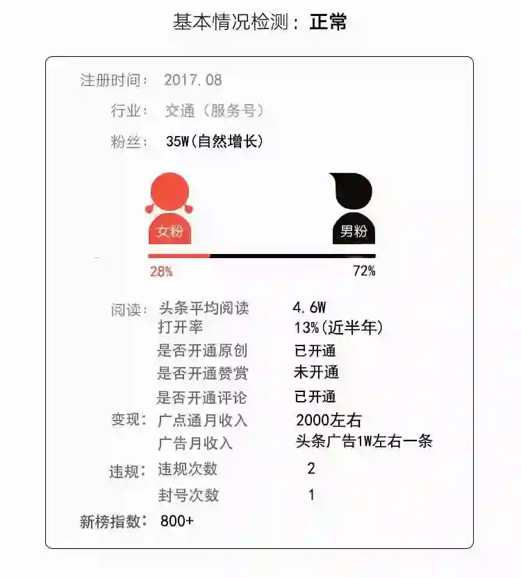 公号创建于2017年8月,内容主要为路况信息和汽车类信息,近半年头条打开率为13%.粉丝数35W,来源于自然增长,主要为男性车主,男粉占比72%.接过几次广告,头条1次1万左右,广告类型为教育类和必要电商广告等。2违规,1封号。因号主精力有限所以打算出售。