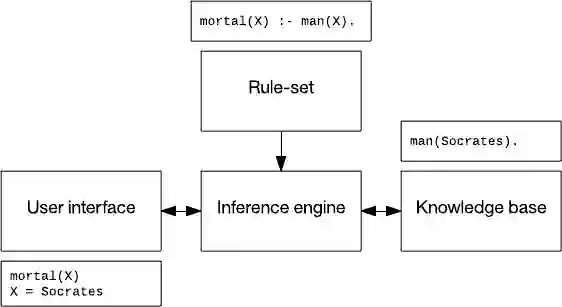 基于规则的系统通常由一个规则集合、一个知识库、一个推理引擎(使用前向或反向规则链)和一个用户接口组成。下图中,我使用了知识「苏格拉底是人」、规则「如果是人,就会死」以及一个交互「谁会死?」
