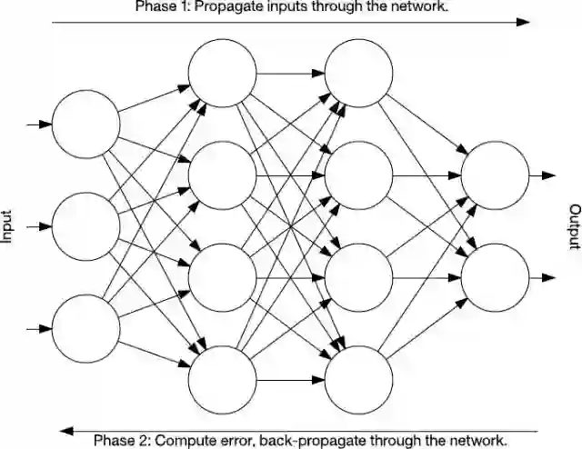 反向传播是一种用于训练多层神经网络的算法。它的工作过程分为两个阶段。第一阶段是将输入传播通过整个神经网络直到最后一层(称为前馈)。第二阶段,该算法会计算一个误差,然后从最后一层到第一层反向传播该误差(调整权重)。