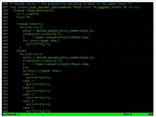 该漏洞的核心是由于407行内部for循环中的数组边界检查不足造成的(上图)。使用精心制作的Vorbis音频文件指定足够大的book-> dim,可以使i大于n,并在408行内部for循环的界限以外访问a []数组。