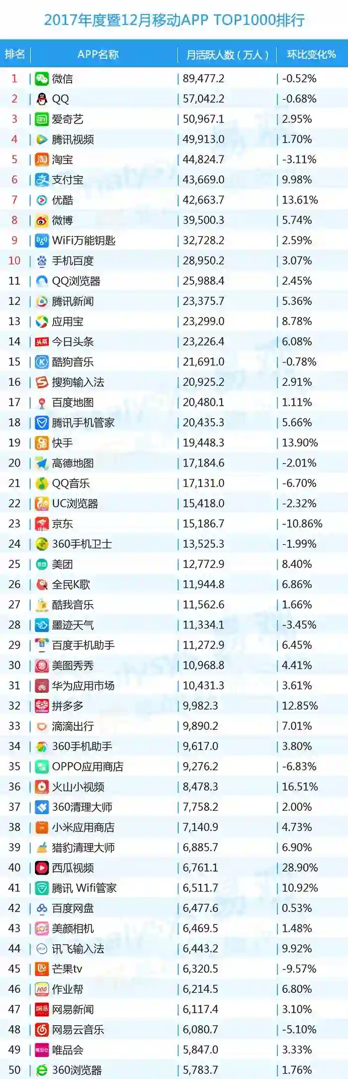 根据易观丰富的移动互联网数据资源储备及大数据分析技术及产品,我们根据易观千帆2017年12月数据,特别制作了《中国移动互联网 2017年度暨12月TOP1000榜单》,并由易观各行业资深分析师进行分析解读。