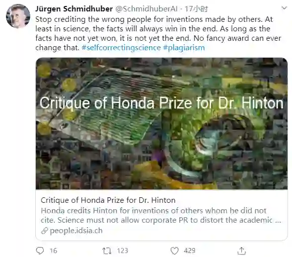 Jürgen Schmidhuber 在推特上表示:「不要弄错新技术的发明者。至少在科学领域中,真相终将显现。真相没有显现,只能说明时候未到。奖项无法改变事实。」