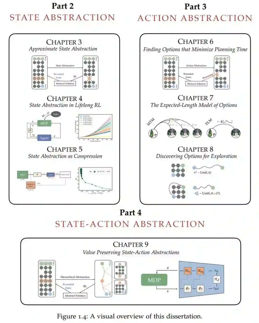 总之,以上各章内容阐述了强化学习的抽象理论。下图为论文结构的可视化呈现。