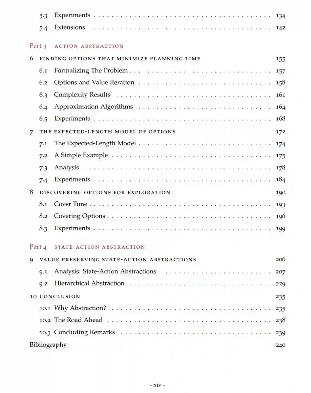 在第8章中,作者研究了抽象行为改善探索过程的可能性。他介绍了Jinnai等人开发的算法,该算法基于构造简易环境所有部分的抽象动作的概念,并证明该算法可以加速基准任务的探索。