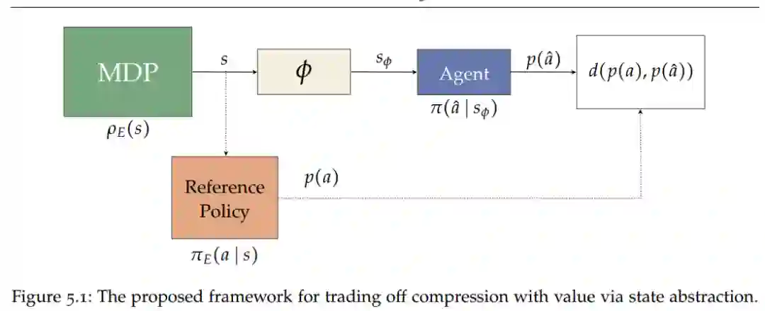 第 5 章介绍了信息论工具对状态抽象的影响。作者在状态抽象和数据率失真理论以及信息瓶颈方法之间建立了紧密的理论联系,并利用这种联系设计了新的算法来高效地构建状态抽象,在压缩和良好行为的表示之间取得了优雅的平衡。作者通过多种方式扩展了该算法框架,充分展示了它发现状态抽象的能力,并且为良好行为的有效学习提供了样本。