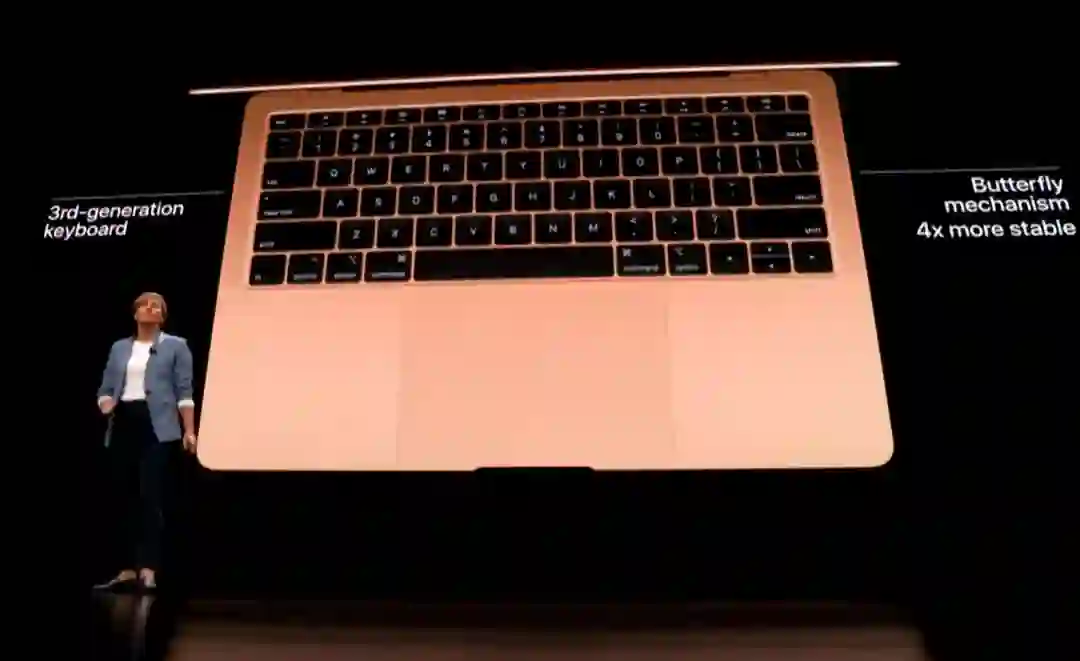 2018 款 MacBook Air 的第三个改进就是键盘,这次是第三代蝶式键盘,苹果表示蝶式键盘的面积更大手感、更舒适,响应更灵敏,即便很薄也依旧稳定和精确,按键稳定性是同样薄的剪刀式键盘的 4 倍以上,敲击按键时下压和弹回干脆利落。同时,新键盘还提供有背光功能。