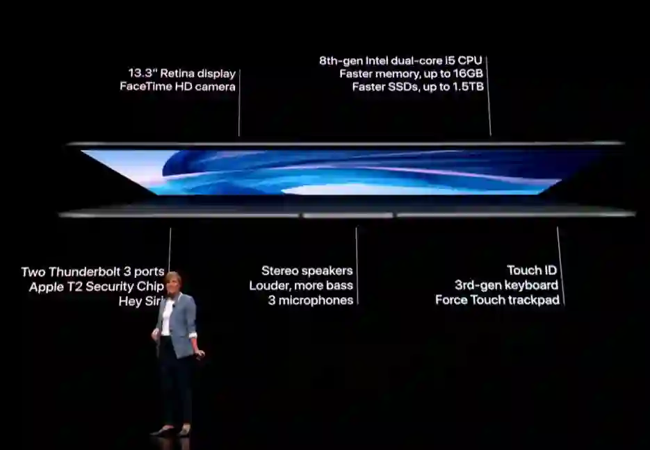10 月 30 日晚上,苹果在纽约召开新品发布会。本次发布会一开场,苹果率先为我们带来了全新的笔记本电脑产品:全新 MacBook Air。这款产品相比老款改进不少,主要更新了 Retina 视网膜显示屏,引入 Touch ID 和 T2 芯片,设有 Thunderbolt 3 接口,声音更大,蝶式键盘和 Force Touch 触控板,处理器和 SSD 性能更强等。