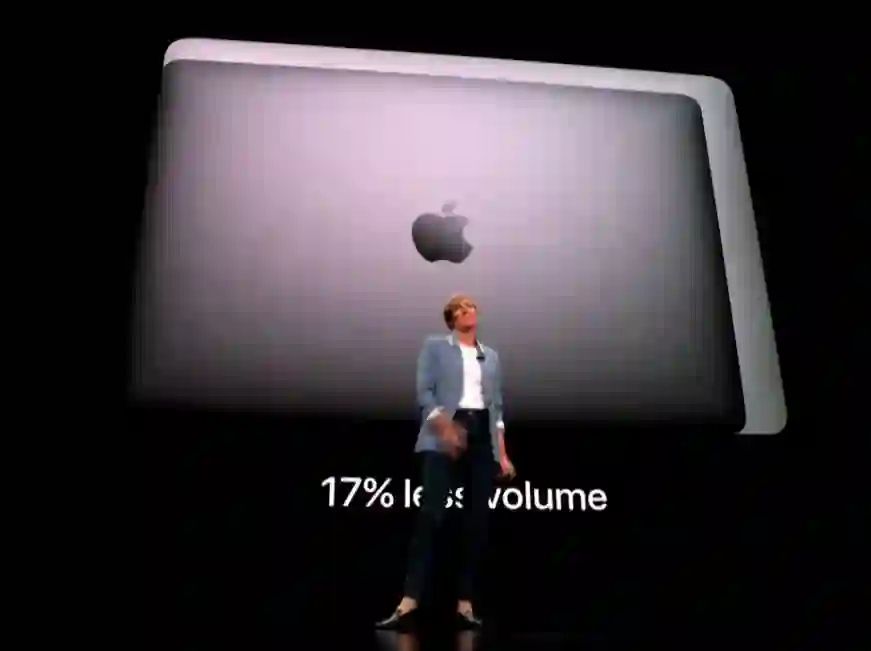 有意思的是,说完了硬件,苹果最后才谈及了 MacBook Air 一直最引以为傲的便携性设计。2018 款 MacBook Air 依然是 100% 全铝外壳设计,简约、美观,有太空灰、金、银三种配色,整体更加小巧便携,体积相比上一代减少了 17%,并且厚度也减少了 10%,只有 15.6mm,重量为 2.75 磅。