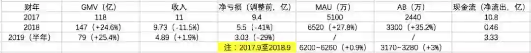 蘑菇街2017财年至2019财年上半年GMV、收入、净亏损、MAU、AB、现金流等数据概况,36氪根据招股书整理