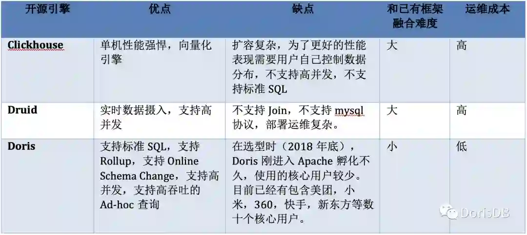 目前开源的OLAP引擎很多,但由于面临大促的压力,我们需要尽快完成选型并进行数据迁移,因此我们只考察了比较出名的几个OLAP系统:ClickHouse,Druid和Doris。最终我们选择了Doris来替换我们的原有系统,主要基于以下几方面的考虑: