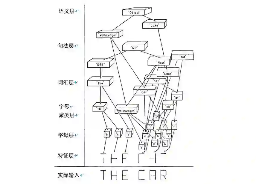 图 3.4. 大卫·鲁梅哈特的草图,消息传递网络如何学习阅读短语“THE CAR”。(来源:美国加州大学圣地亚哥分校的大脑与认知中心。)