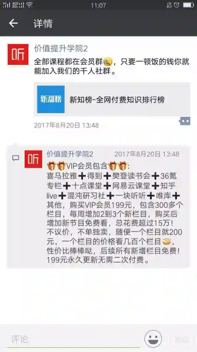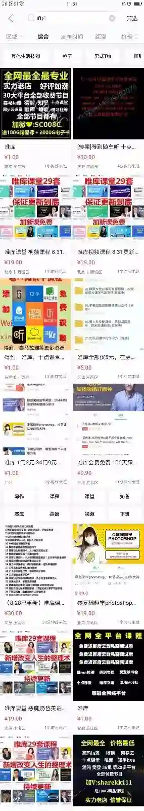 这个寻找过程是如此容易,无论是以淘宝、闲鱼、转转为代表的电商体系,以58同城为代表的信息发布体系,还是各种社交平台,只要搜索“得到”、“喜马拉雅”、“摩尔金融”等关键字,都可以看到几十甚至上百页相关商品,在购买或者私信后,用户就会被拉到各类社交群里,最终的下载路径往往是百度云盘,内容为付费平台不断更新的全年内容,而价格往往仅有几十元,为平台直接购买的十分之一甚至百分之一。