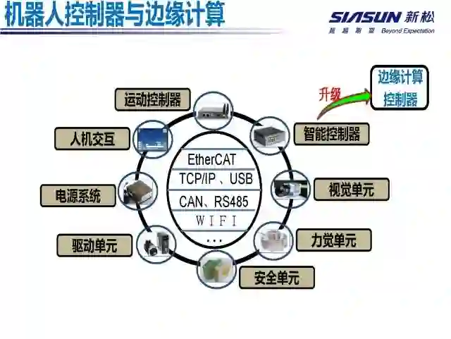 基于以上两个目标,边缘计算控制器需要实现通信、数据和应用三个平台的建设:机器人的通信平台,使边缘计算控制器能便捷的完成与PLC、各类传感器、智能仪表、智能IO模块等设备的数据交互;机器人的数据平台,使机器人自身数据、工作站等环境数据得到有效的采集和管理,以应对行业应用统计和分析使用;机器人应用平台,通过搭载监控、智能诊断、安全等机器人服务,集成码垛、调度、点焊、弧焊等工艺包,扩展工业机器人应用领域,提高信息化程度和生产制造服务质量。