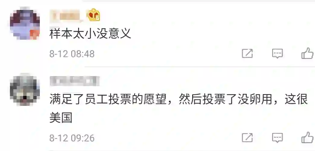 当然也有很多中国网友指出,偌大一个十几万人的公司,才有250人参与投票,样本太小,根本不能说明问题。