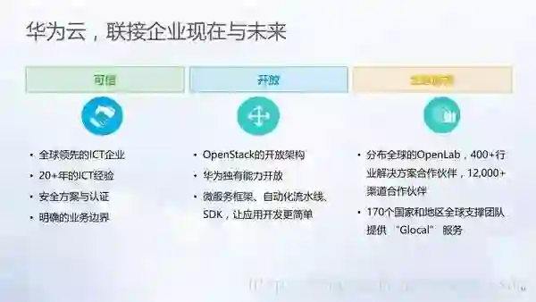 郑殿海表示,整个华为云的目标是Cloud1.0和Cloud2.0两个市场,这样的划分在过去十年的互联网中得到了大量的应用,应用的主要领域是在信息以及信息服务产业,解决了很多流通环节的问题,创造了巨大的价值。这个市场在未来十年依然会有非常快速的发展。但当前,先进的技术、理念已经逐渐的进入到了生产和制造环节,未来这个市场的发展甚至要大于或者重于Cloud 1.0,因此,华为希望在这两个领域都能够帮助企业去创造价值。而创造价值的手段一是通过华为能力的开放,华为在云上的定位是实践者、推动者和使能者,华为会把过去30年里积累下来的一些能力通过华为云平台向外开放,服务于整个产业。二是适配客户的需求,华为云会根据Cloud 1.0和Cloud 2.0客户需求的不同,为客户提供不同的解决方案。 而华为云也会通过自己在可信、开放、全球服务三方面积累的优势,帮助客户创造价值。