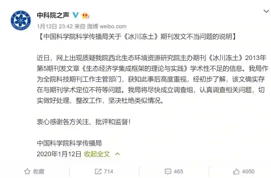 1月12日晚,中国科学院西北生态环境资源研究院、中国科学院科学传播局回应,该文确实存在与期刊学术定位不符问题。并在网上和微博上刊发了具体说明。