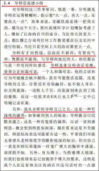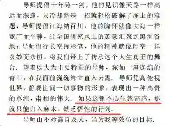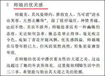 文章的第三部分则对师娘展开了赞美:由“女子无才便是德”、“给导师做饭是一种义务”、“见利思大义”三个小篇章组成。