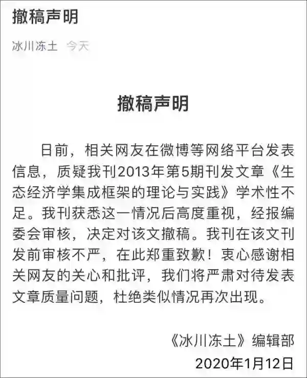1月12日,《冰川冻土》通过官微回应称,已决定对徐中民的《生态经济学集成框架的理论与实践》进行撤稿。同时,对此前的审核不严致歉。