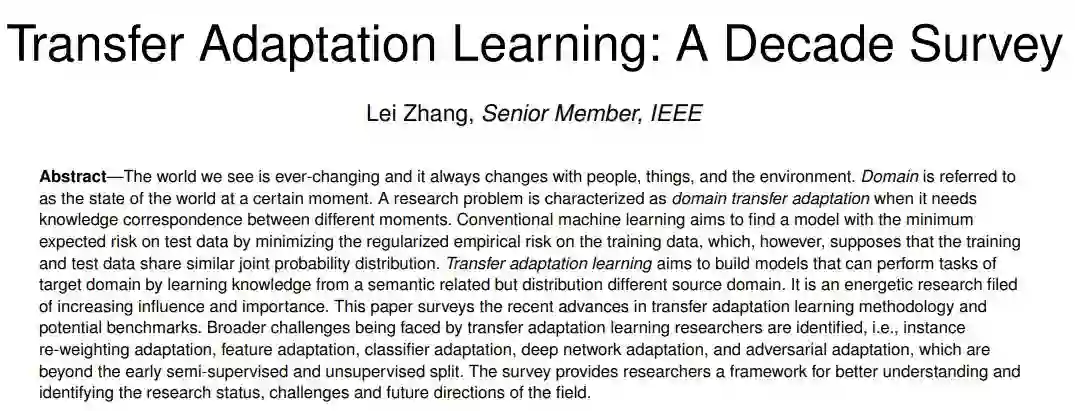 题目:Transfer Adaptation Learning: A Decade Survey