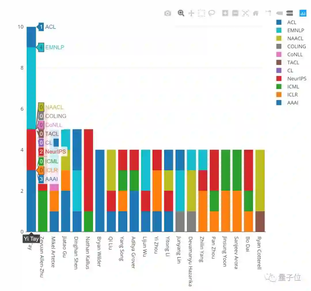 之后便是张潼(最近从腾讯AI Lab离职),21篇;清华大学孙茂松和达姆施塔特工业大学的Iryna Gurevych,每人20篇。
