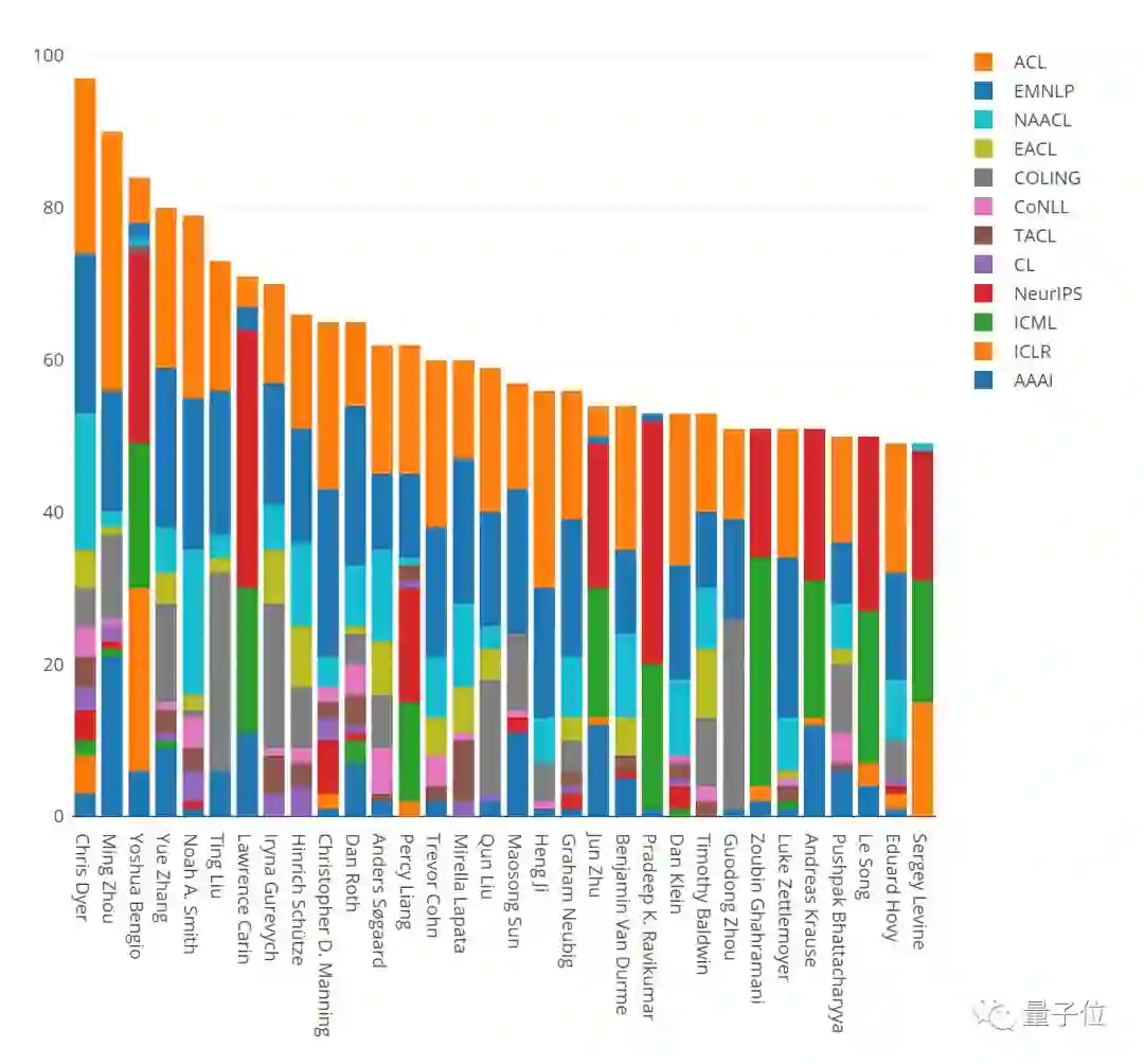 周明紧随其后,然后是蒙特利尔大学的Yoshua Bengio,西湖大学的张岳,华盛顿大学的Noah A. Smith。