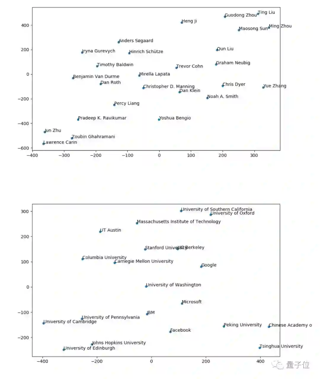最后,Marek Rei对作者和组织进行了一些主题聚类。他收集了所有与特定作者/组织相关的论文,小写处理和token化之后,用LDA处理,然后利用t-SNE可视化。得到了各个作者和机构研究方向的相似情况。