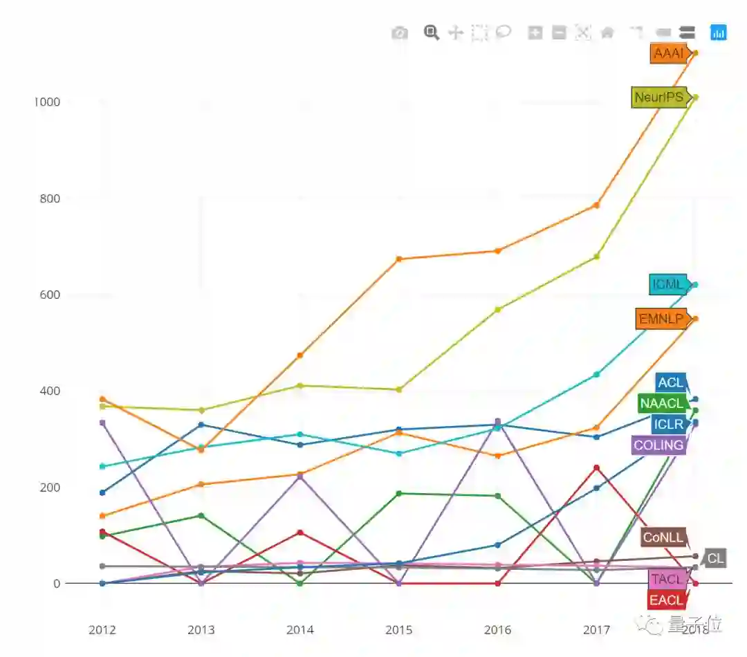 2012年到2018年,各个顶会发表论文的数量持续增长。