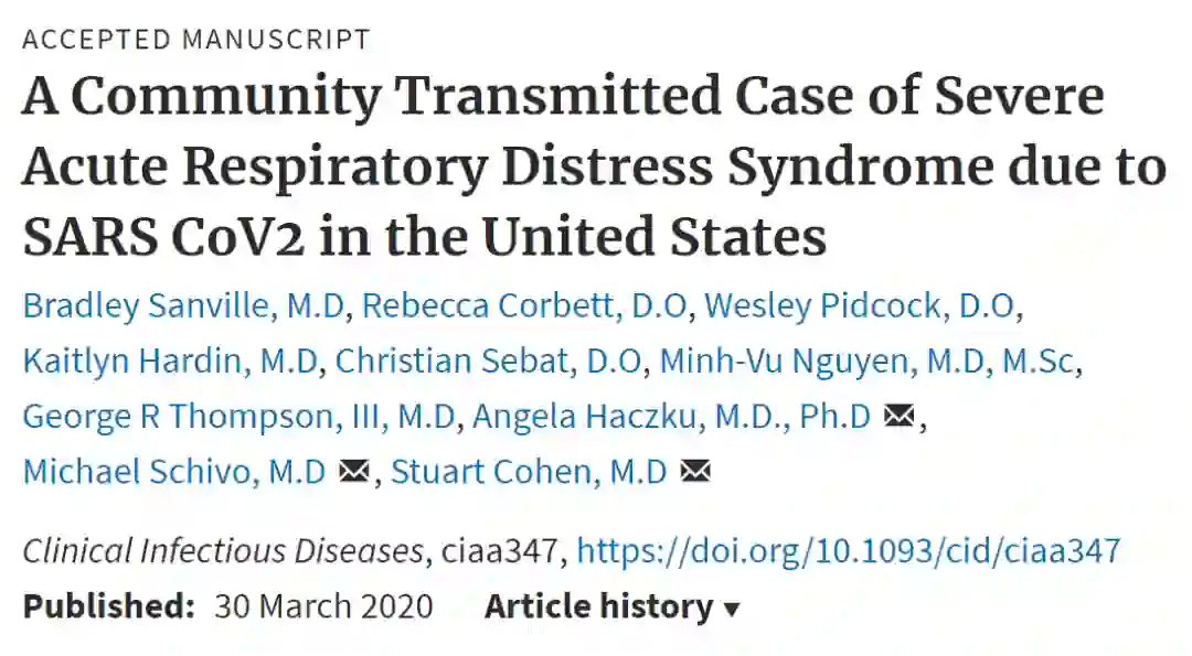3月30日,美国加州大学戴维斯分校的研究人员在 Clinical Infectious Diseases 杂志发表了题为:A Community Transmitted Case of Severe Acute Respiratory Distress Syndrome due to SARS CoV2 in the United States的论文。