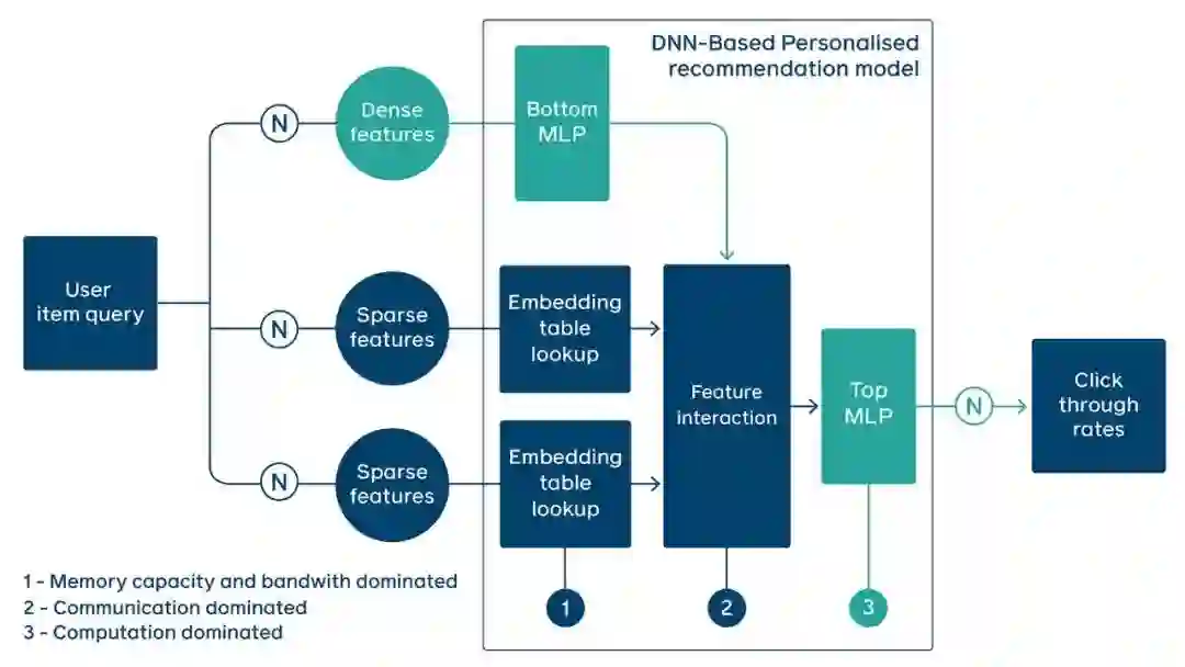 该图显示了深度学习推荐推断的执行流程:模型的输入(N)是连续(密集)和类别(稀疏)特征的集合。使用嵌入表将推荐模型特有的稀疏特征转换为密集表示(表示为蓝色)。嵌入表的数量/大小、每个表的稀疏特征(ID)查找的数量、底部FC层和顶部FC层的深度/宽度根据用例的不同而变化。