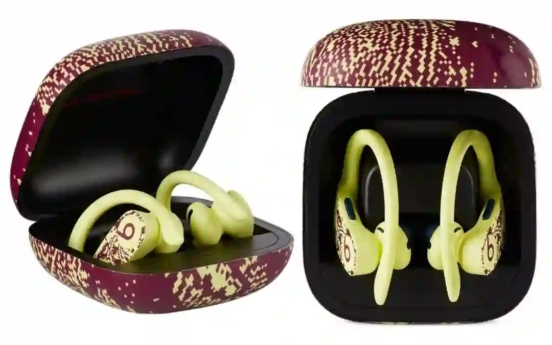 苹果公司与伦敦一位设计师合作,推出了一款特别版的PowerBeats Pro耳机,耳机上有特殊而时髦的黄色和深紫色图案,售价为250美元。