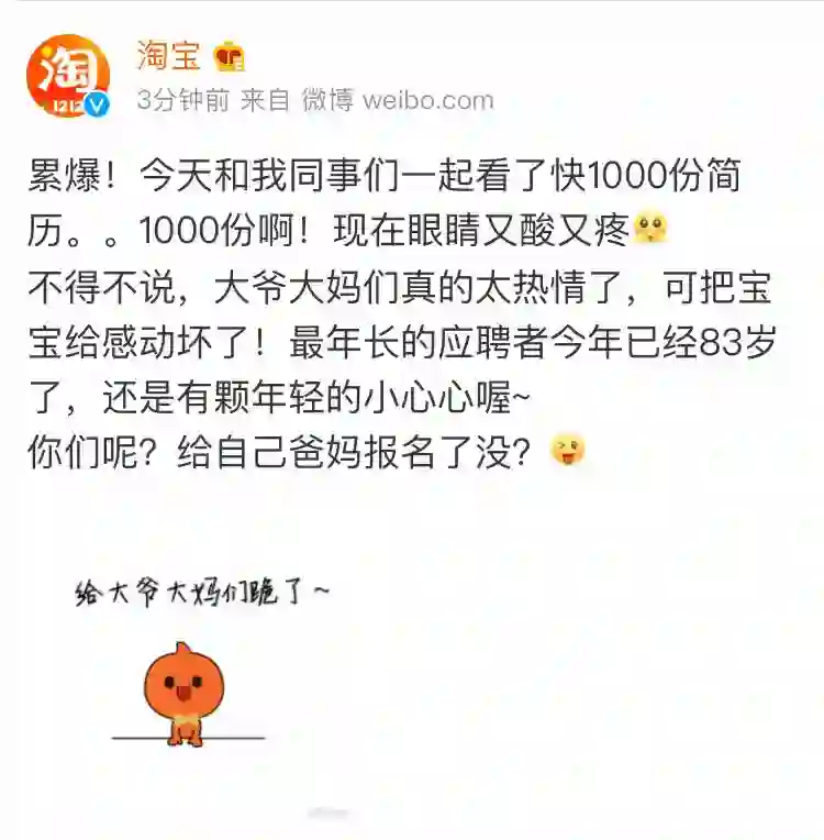针对这场意外走红的这场招聘,淘宝表示,“目前工作人员正在加班加点筛选简历,并将很快安排候选人参加线下沟通会,也会邀请淘宝产品经理跟老年候选人们进行深度沟通”。