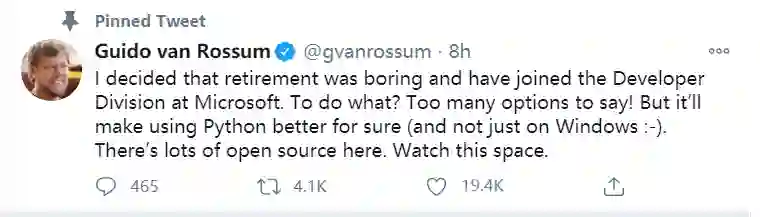 【新智元导读】今日凌晨,64岁的 Python 语言的创建者 Guido van Rossum 发推表示,退休生活太无聊,决定入职微软。
