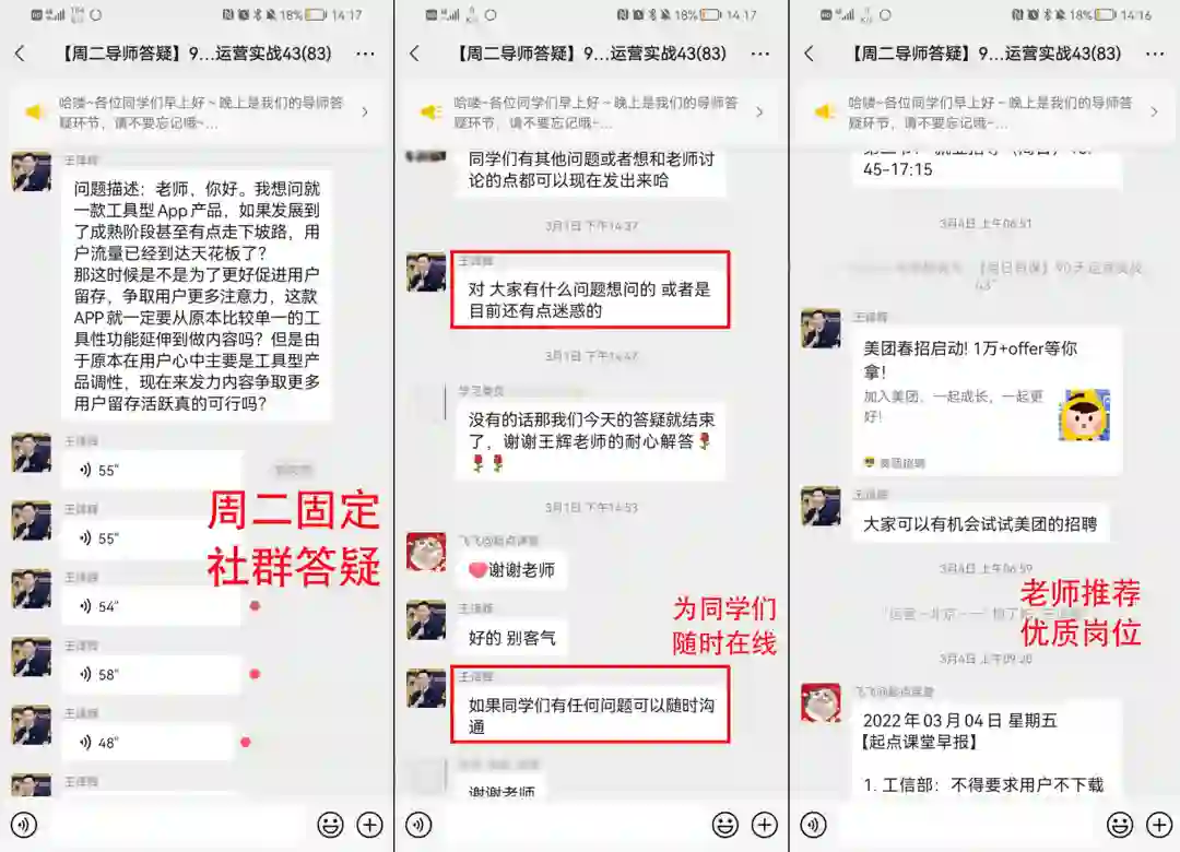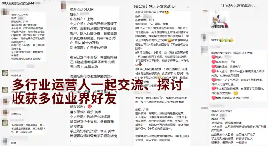 除了高质量的导师圈子,也可以帮你拓展朋友圈子,让你收获更多专业的运营朋友,一起讨论知识讨论业务。