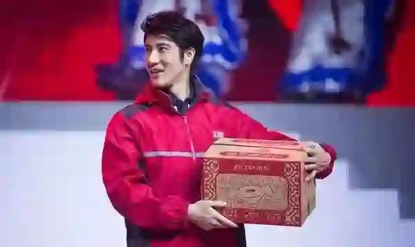 2016年12月京东年会,王力宏现身当快递员,给京东员工送福利。