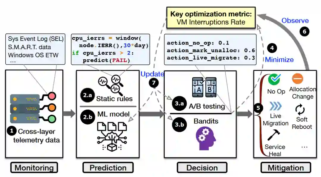 高可靠性一直是各大云计算平台的追求。针对云计算集群内部发生的故障,传统的做法是“发生故障->造成负面影响(服务中断、性能下降等)->检测到问题->诊断、归因->修复问题->重新部署”,而在这个过程中用户会持续被影响,严重影响用户的体验并可能给用户造成严重的经济损失。为了解决这一问题,微软亚洲研究院的研究员与微软 Azure 团队一起提出了一种基于“预测+自适应缓解”的故障处理方案,命名为 NARYA。
