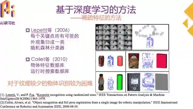 基于稀疏特征的方法和传统的基于几何的方法有一定的相似性,都是对于纹理较少的物体识别较为困难,对于此类物体的识别,后面介绍的基于模板的方法较好。