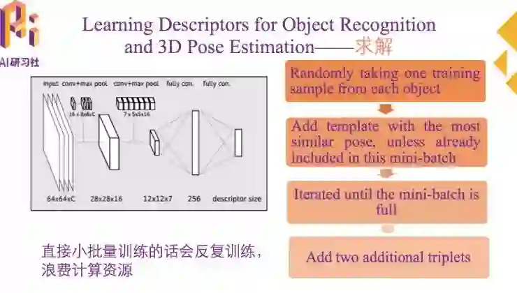 首先从每个物体里随机选取一个训练样本;然后添加训练样本最接近的位姿模板,pairs就是这些最接近的位姿模板和原来随机选取的训练样本产生的;迭代完成,直到小批量总数取满为止。取完之后,在每个训练样本中添加另外的triplets量,来自不同物体最相似的模板或者相同物体位姿差异较大的模板。训练样本取好之后,就可以进行训练了。