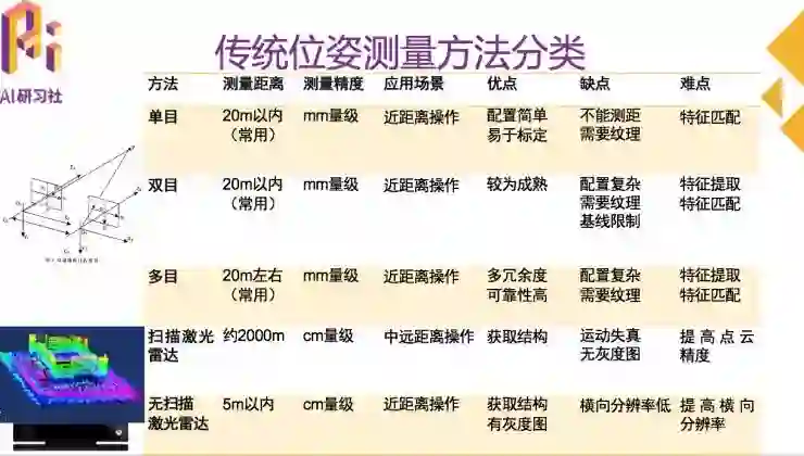 传统的位姿测量方法主要包括基于单目的方法,基于双目的方法,基于多目的方法,基于扫描式激光雷达的方法,基于非扫描式激光雷达的方法,近年来发展迅速的基于SLAM的方法,以及多传感器融合的方法。