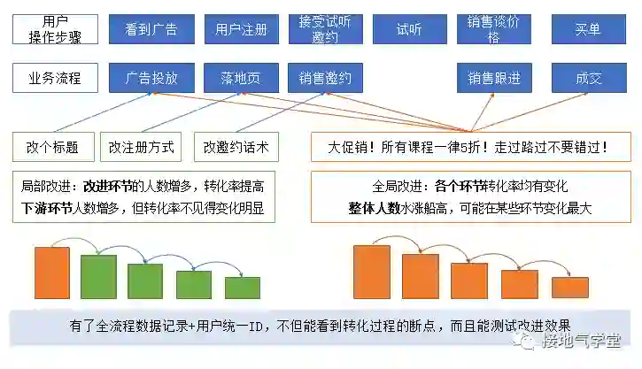 这个阶段的分析,是典型的知其然,不知其所以然的分析,大部分分析只能通过成交结果去猜。如果只有这个阶段的数据,想做深入分析,还是得依靠调研。比如传统企业想了解门店成交流程,会做门店调查,研究消费者在门店的动线,询问消费者体验。