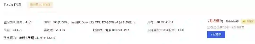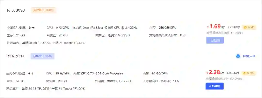 AutoDL 给当代卡皇提供了多种配套 CPU 规格:内蒙 A 区有 ¥2.28/h 每卡搭配 15 核心 AMD 7543,深圳 A 区有 ¥2.28/h 每卡搭配 14 核心 Intel 金牌 6330,北京 A 区有¥2.28/h每卡搭配 24 核心 AMD 7642,内蒙 A 区和南京新手区有若干 ¥1.88/h~¥1.99/h 搭配 Intel 银牌 CPU。最具性价比的是潮汐算力区,定价 ¥1.69/h 的 3090,配备 256GB 内存,建议同学们去搜一下怎么把内存当硬盘使用,手动狗头。