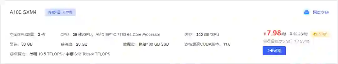 此为 NVLINK 版,整机配置对标 DGX-A100, 租用 8 卡可用显存将线性拓展至 640GB。