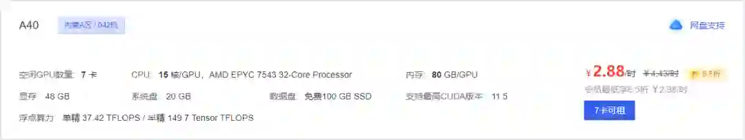 A40 可能是这一代专业卡里最低调的,拥有略高于 3090 的单精度算力和 A100 48%、高于 V100 的半精度算力。AutoDL 很快还会推出有 NVLink 桥加持的 A40,显存可拓展至 96GB,你真的不想试试么?